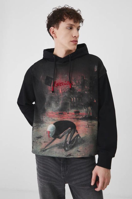 Кофта с капюшоном из специальной коллекции Zdzisław Beksiński x Medicine. Модель изготовлена из трикотажа с принтом и аппликацией.